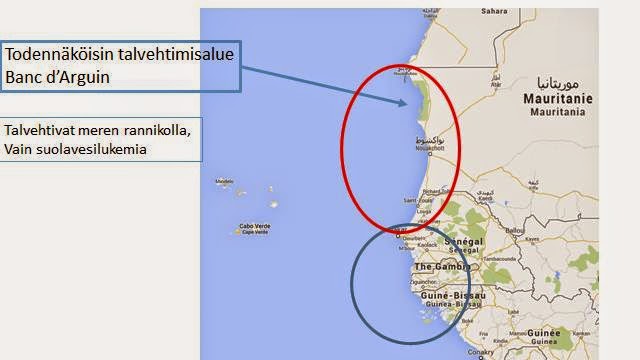 Kun paikannetaan kaikkien geopaikanninlintujen sydäntalvisen sijainnin keskipiste, löytyy Suomen etelänsuosirripopulaation keskeisin talvehtimisalue, Mauritanian Banc d'Arguin, Unescon maailmanperintökohde, kymmenien tuhansien lintuparien pesimäalue ja miljoonien Euraasian kahlaajien talvehtimisseutu. Ja osa Oulun seudun etelänsuosirreistä on voinut talvehtia vieläkin etelämpänä, jopa Senegalissa ja Gambiassa saakka. Ei tiennyt rengastusaineisto tätä! Suomen etelänsuosirrien eteläisin talvilöytö oli ennen tätä Marokon rannikolta, Banc d'Arguinista 1500 km kohti Espanjaa.
