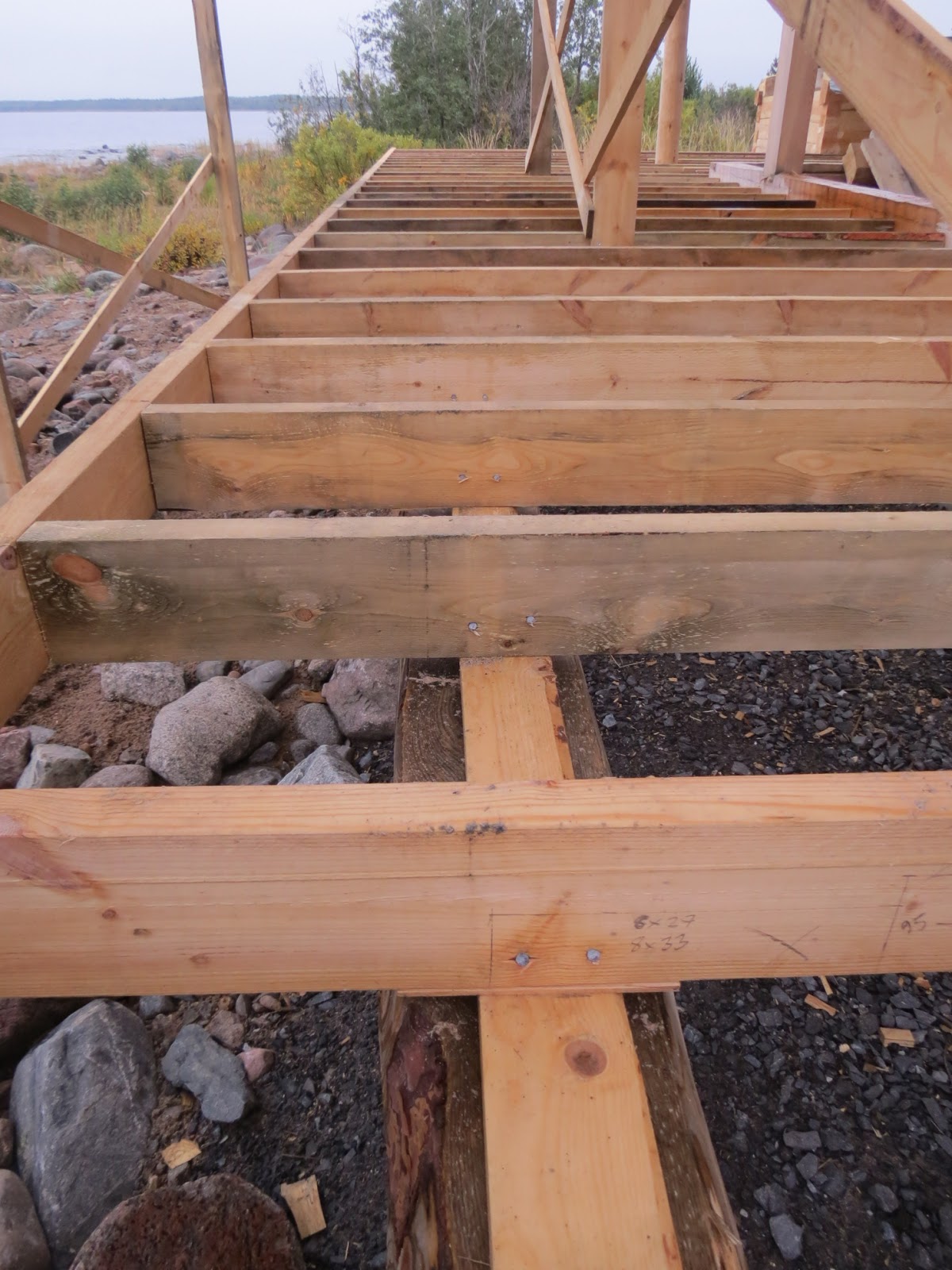 Menipä muutama viikko - Hailuotoon kokoamaamme hirsihuvilaan on ilmaantunut vesikate, rännit, terassi ja terassin katoksen runko sekä osa alakerran ikkunoista ja liukuovista, muun muassa.